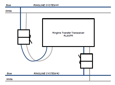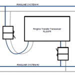 The transfer transceiver will typically be used where contiguous fail-safe control of a long conveyor e-stop system is required. It enables conveyors up to 24km in length (2 x 12km Ringline systems) to be safely controlled.The interlocking of systems is achieved using the RL6XFR in conjunction with the Cat 4 Digital transmitter. The Cat 4 transmitter is connected to the outputs of the safety card via an auxiliary on the contactor (see Figure 4). If the Cat 4 is programmed to transmit on the last Ringline address the Transfer Transceiver will reproduce this status on the 4th last address on the remote RinglineIf we do the same on both sides of the transfer transceiver we have provided an easy way of sending the safety card status from one Ringline system to the other. If we set up the block mask on each safety card to include the 4th last address we have now interlocked the safety cards on either side of the transfer transmitter; if one system trips the other will immediately follow. We should note the redundancy that is achieved by this arrangement; in particular, the transfer of two redundant safety outputs and their compliment state, to ensure proper operation of the safety function with a single failure in either the Ringline control system, the field-bus or the transfer transceiver.
