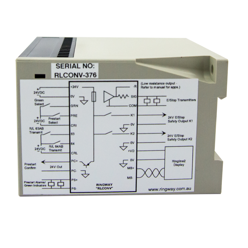 RLCONV can be used on any conveyor or machine that requires a Pre Start Alarm and / or a distributed network of emergency stop switches or devices to be interlocked to a control system in a failsafe manner. Ringline has a long history of reliable performance as an emergency stop signal line and remote whole-current isolation controller for conveyors in harsh environments. Any Ringline transmitters that are not allocated to the safety function can be used to provide chute full, belt tracking, bearing temperature monitoring or any other remote PLC input requirement.