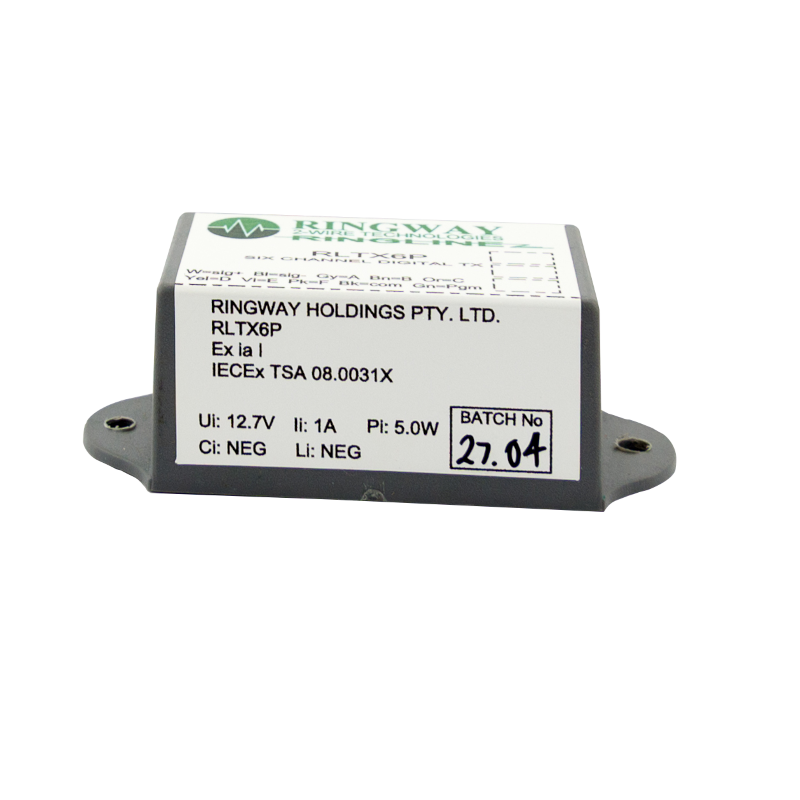 The transmitter is used in conjunction with the Ringline contact status monitoring and distributed emergency stopping system. The 6 channels are grouped as three pairs and each pair may be programmed to any Ringline A/B address.